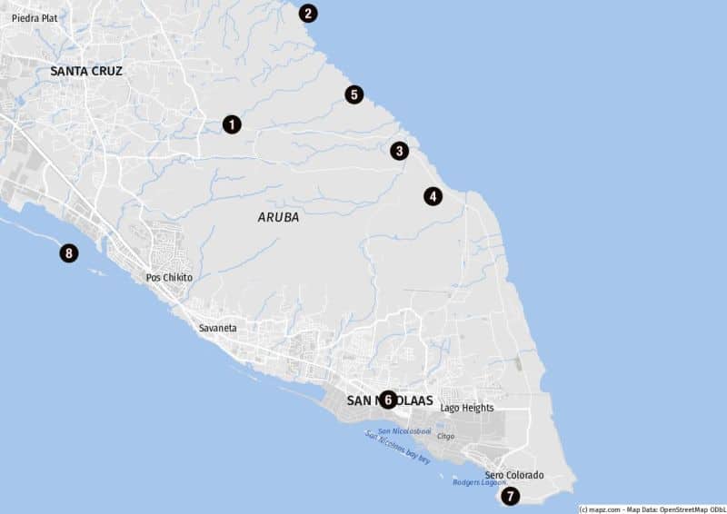 Karte der Highlights in der Südhälfte von Aruba: 1. San Fuego Entrance zum Nationalpark Arikok , 2. Conchi Natural Pool (Nationalpark Arikok), 3. Fontein Cave (Nationalpark Arikok), 4. Quadirikiri Cave (Nationalpark Arikok), 5. Dos Playa (Nationalpark Arikok), 6. San Nicholas, 7. Baby Beach, 8. De Palm Island
